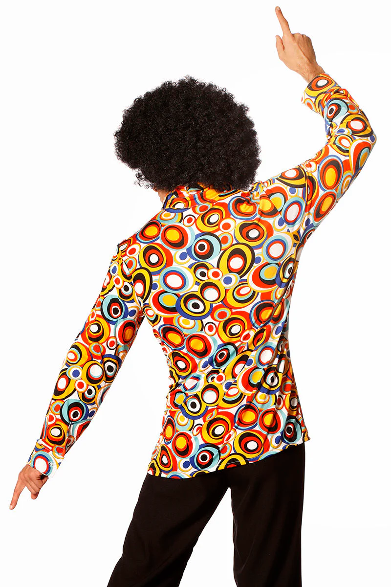 De jaren 70 blouse is voorzien van een opvallend cirkeldesign, dat de kenmerkende stijl van die tijd weerspiegelt. De kleuren zijn levendig en contrasterend, waardoor je een echte eyecatcher bent op elk feest of evenement.