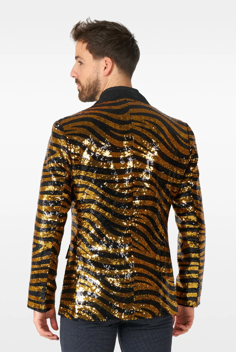 Feestbeesten schrikken nooit terug voor een beetje glitter en glamour. Als je van de dansvloer je thuisgebied wilt maken, is de Tiger Royale-blazer alles wat je nodig hebt. Dit glanzende jack is bedekt met opvallende pailletten die benadrukken dat je zowel stoer als fantastisch bent. Ga ze tijger halen!